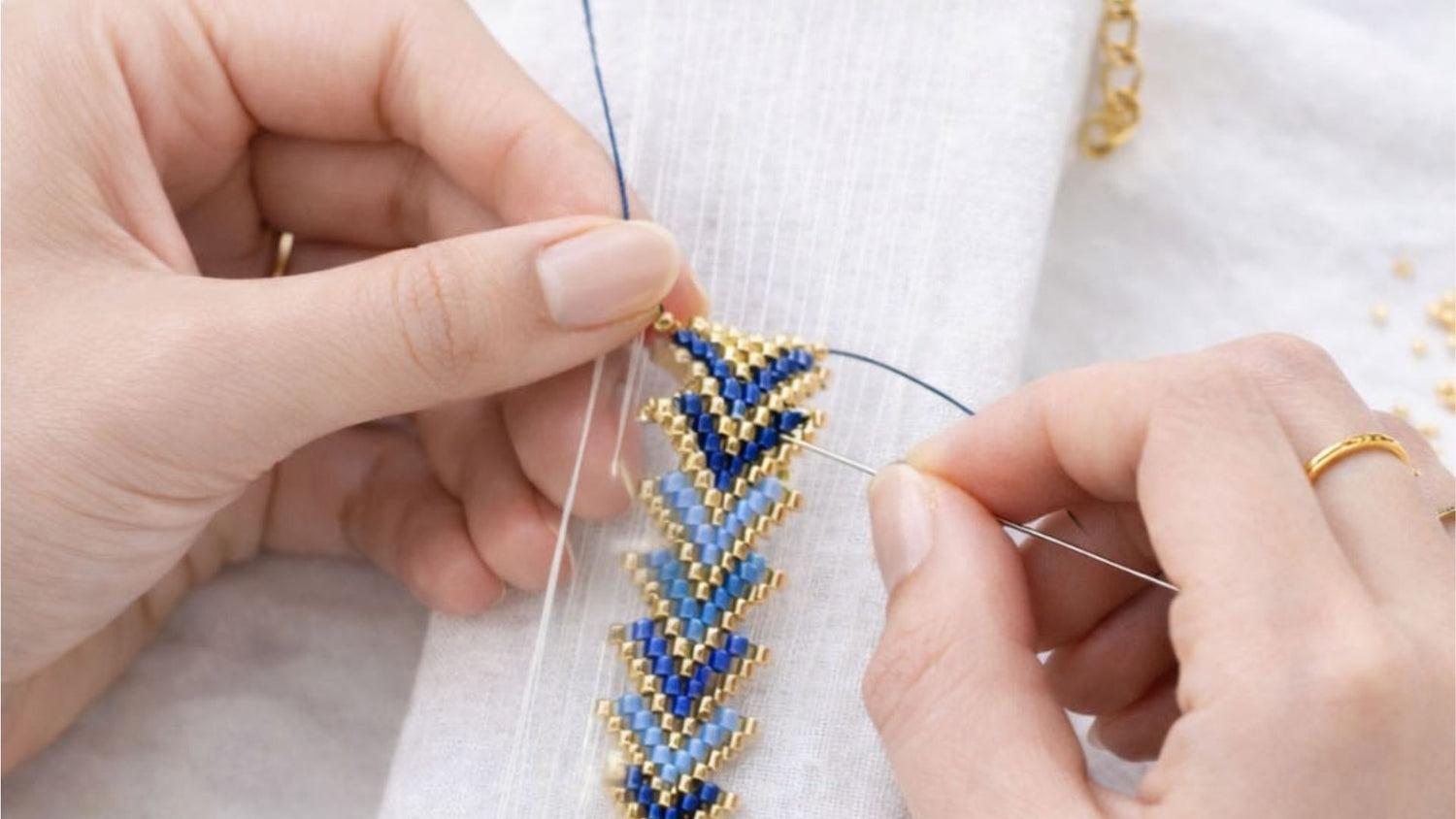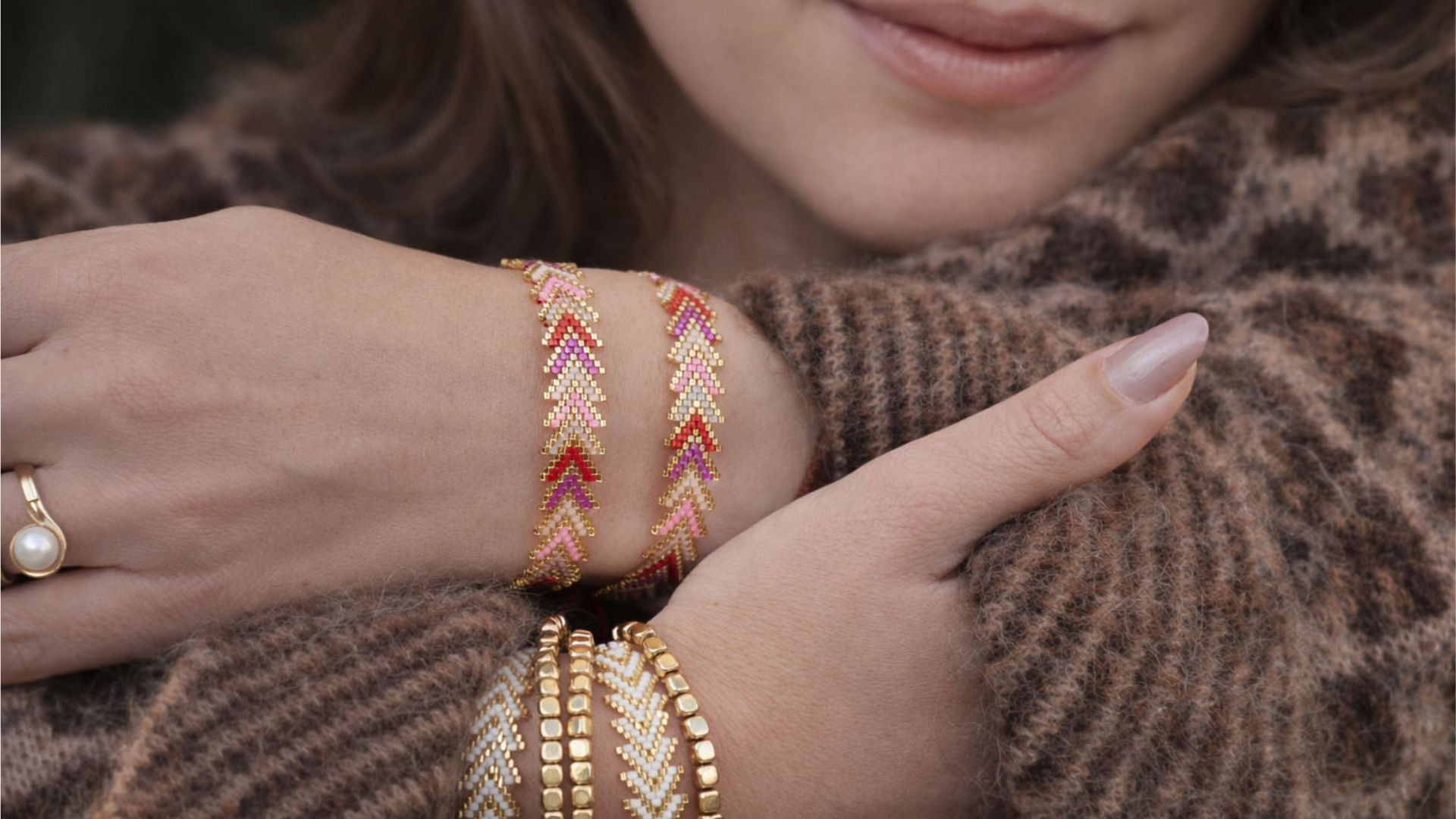 Des perles d’hématite dorées, puissantes et lumineuses, associées à des chevrons colorés tissés à la main. Des textures, des nuances, des contrastes, qui font de chaque bijou une pièce unique, pensée pour sublimer celles qui les portent.