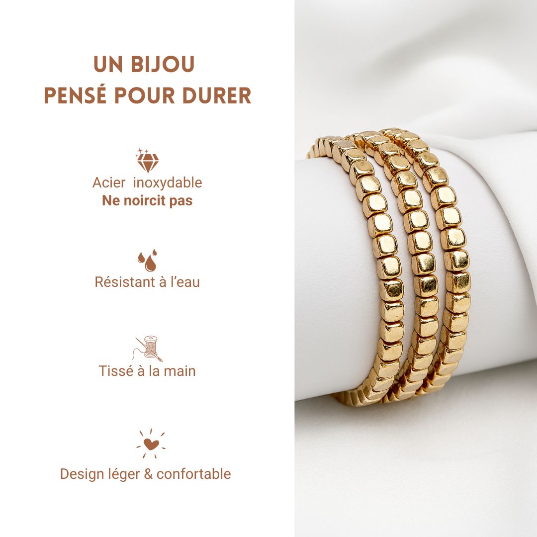 • 3 bracelets en perles carrées en acier inoxydable (hématites) - élastique, ajustable à tous les poignets.