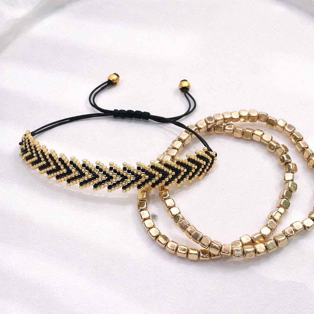 Chez Hymaya, chaque bracelet est pensé comme une pièce unique qui allie perles d’hématite dorées et bracelets chevrons tissés avec minutie.