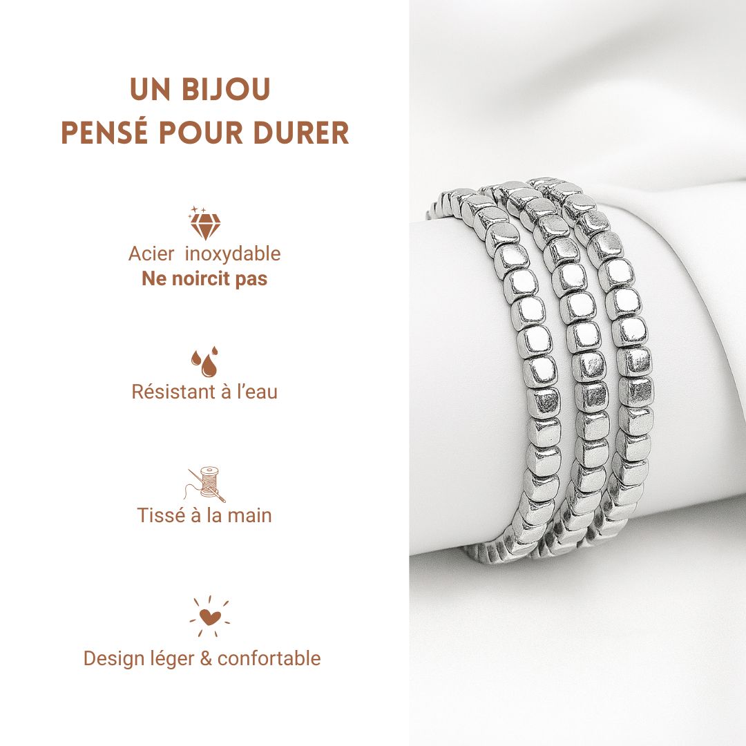 • 3 bracelets en perles carrées en acier inoxydable (hématites) - élastique, ajustable à tous les poignets.