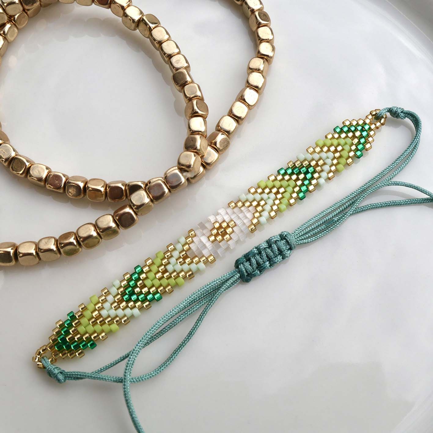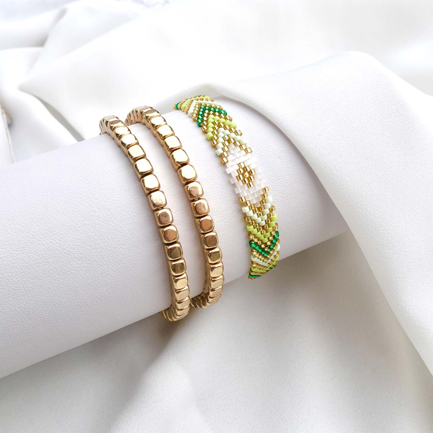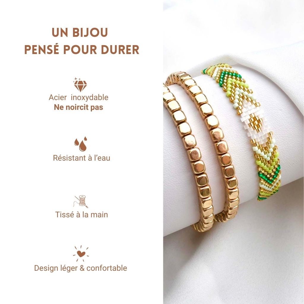 Ce trio associe un bracelet chevron entièrement tissé à la main, mêlant des nuances de vert, turquoise et rose sublimées par de délicates touches dorées, à deux bracelets en perles d’hématites dorées en acier inoxydable de grande qualité, sélectionnées pour leur éclat durable et leur résistance au quotidien.