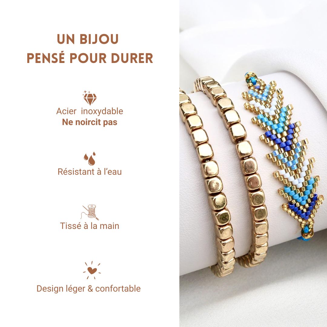 Ce trio associe deux bracelets en hématite dorée à un bracelet chevron aux nuances de bleu et de blanc, rappelant les reflets lumineux d’un lagon ensoleillé.