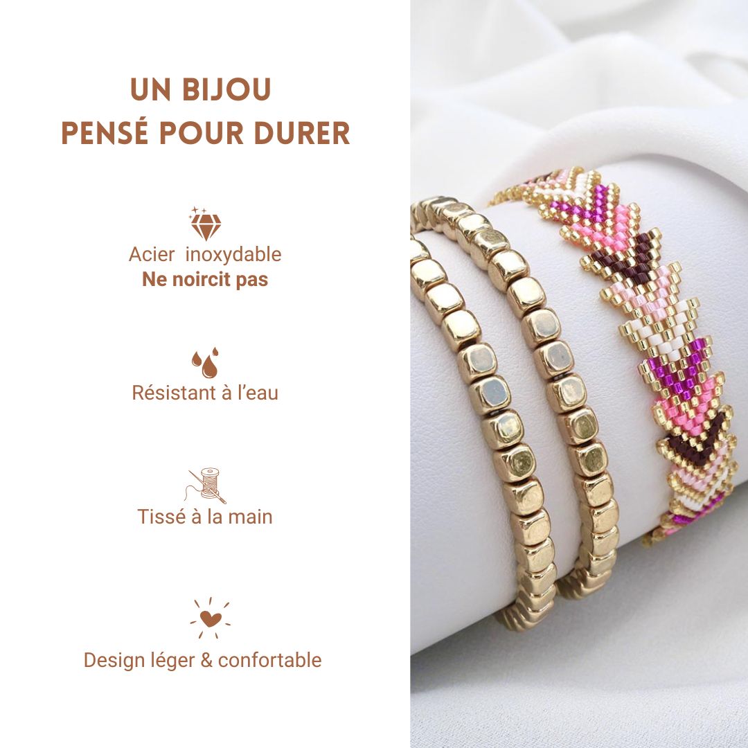 Ce trio associe deux bracelets en hématite dorée à un bracelet chevron tissé aux nuances de rose, fuchsia et chocolat, pour un rendu à la fois délicat et affirmé.